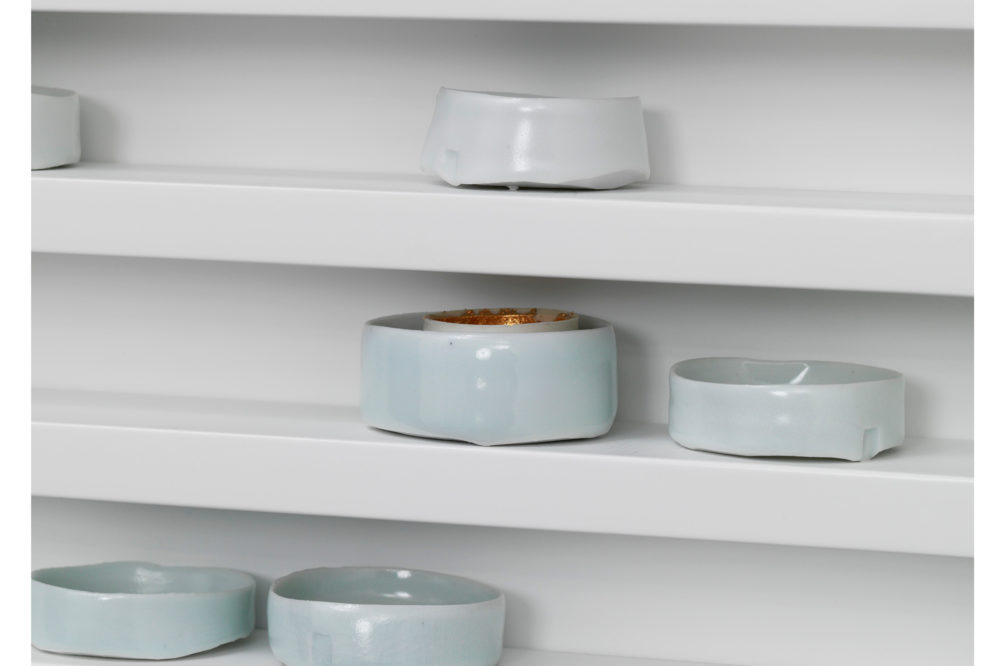 7 porcelain vessels in a plaster-lined, white lacquer cabinet