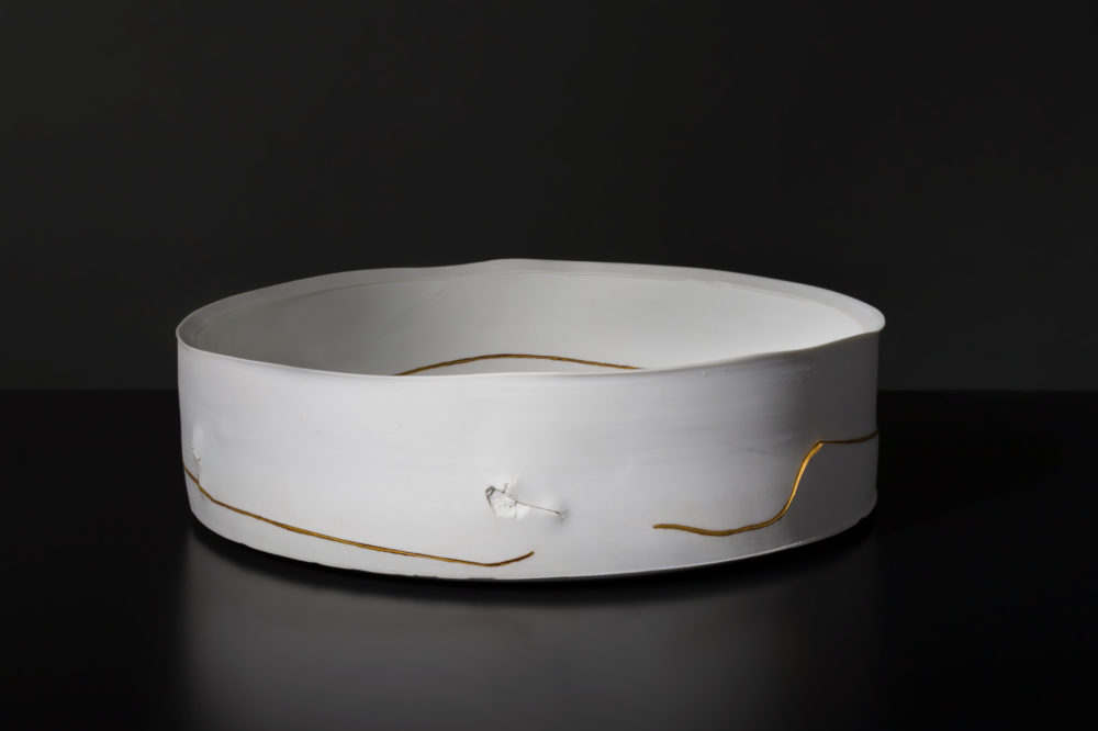 In the studio I had two old Chinese bowls from the Song dynasty. One was patched on the rim with iron. The other had a beautiful thin golden thread running from the rim, repaired using the Japanese art of kintsugi. Kintsugi is not an art of erasure—the invisible mend, the erasing of a mistake—but rather a way of marking loss. Both these bowls were central to the making of this work.